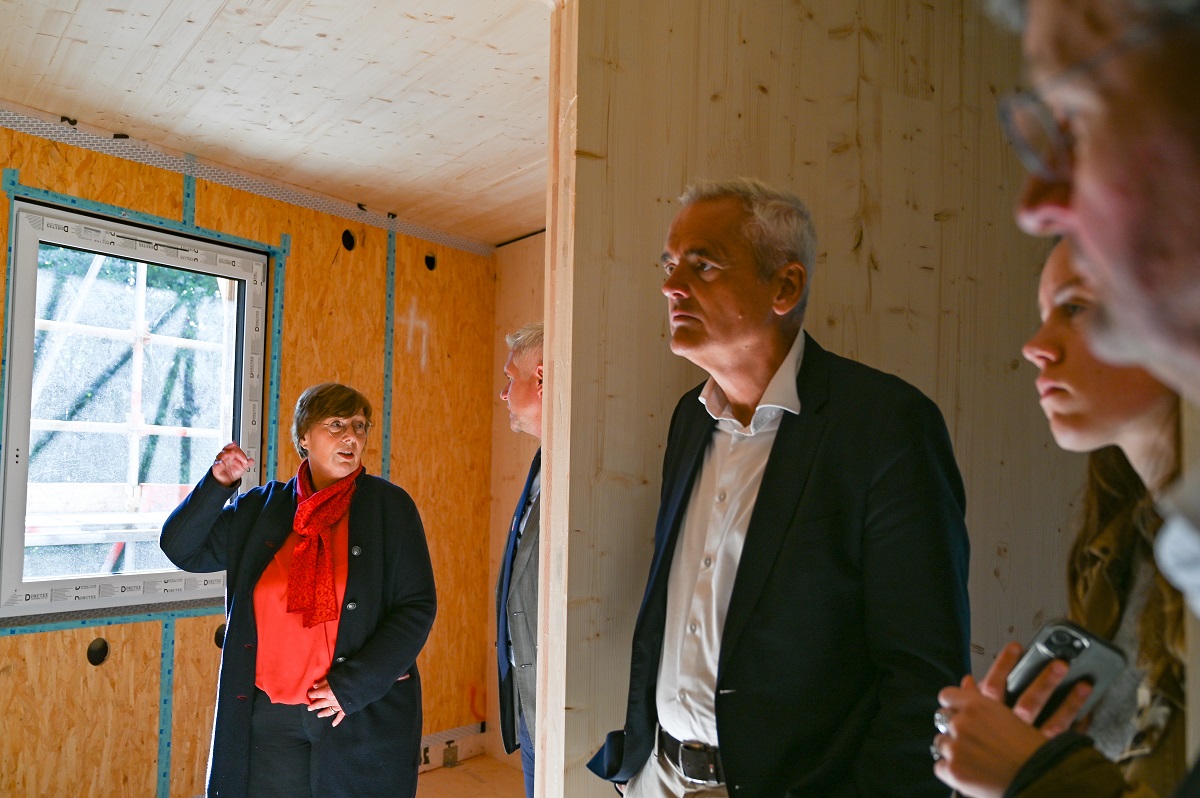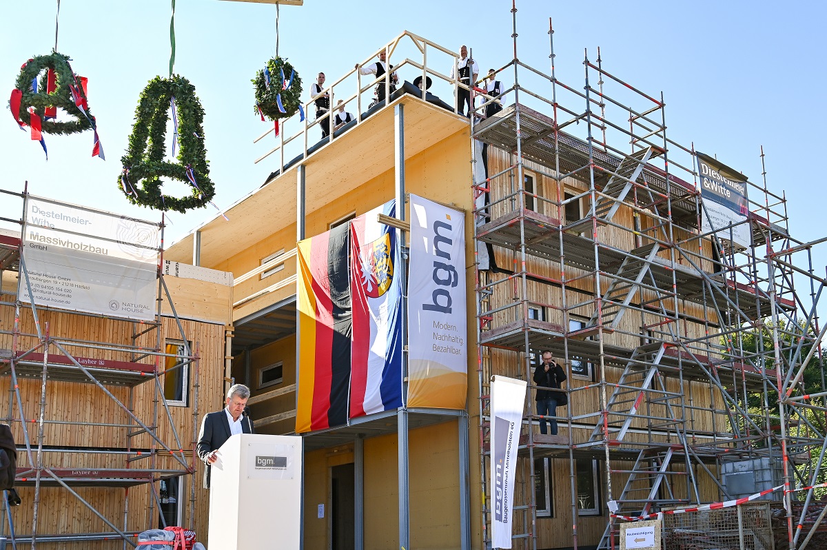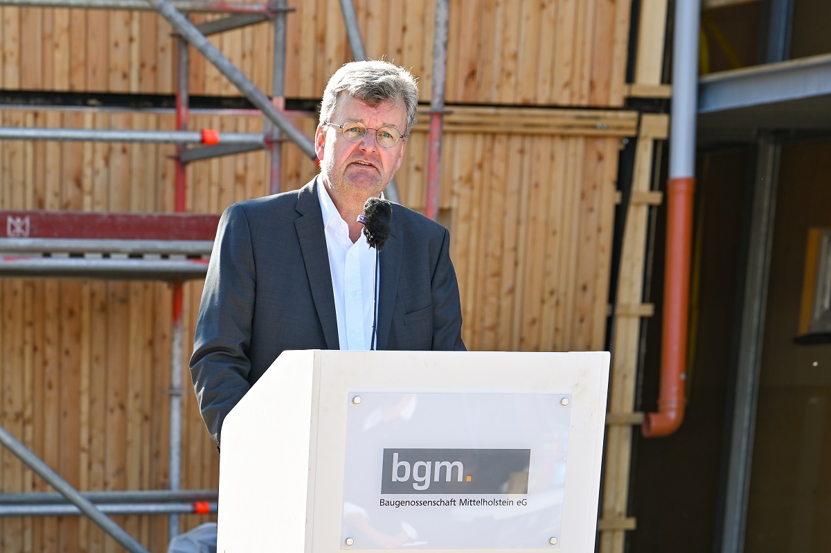 Die Freude war groß bei allen Beteiligten: Erst Ende März dieses Jahres war der erste offizielle Spatenstich für unser innovatives Wohnungsbauprojekt erfolgt, für das nach nur sechs Monaten mit dem Richtfest nun ein wichtiger Meilenstein begangen wurde. „Erstmals setzen wir beim Bau eines Mehrfamilienhauses gänzlich auf einen nachhaltigen Holzbau“, erläutert bgm-Vorstand Stefan Binder die Besonderheit des Bauvorhabens. Tatsächlich sind sämtliche Wände und Decken aus dem nachwachsenden Werkstoff gefertigt. Lediglich beim Keller musste konventionell mit Beton gearbeitet werden, gleiches galt wegen geltender Brandschutzvorschriften für das Treppenhaus und die Laubengänge. Entworfen wurde das Projekt vom Kieler Architekturbüro BSP Architekten BDA.