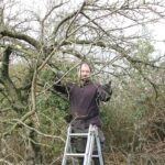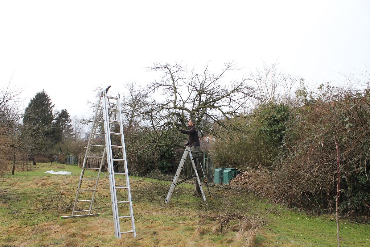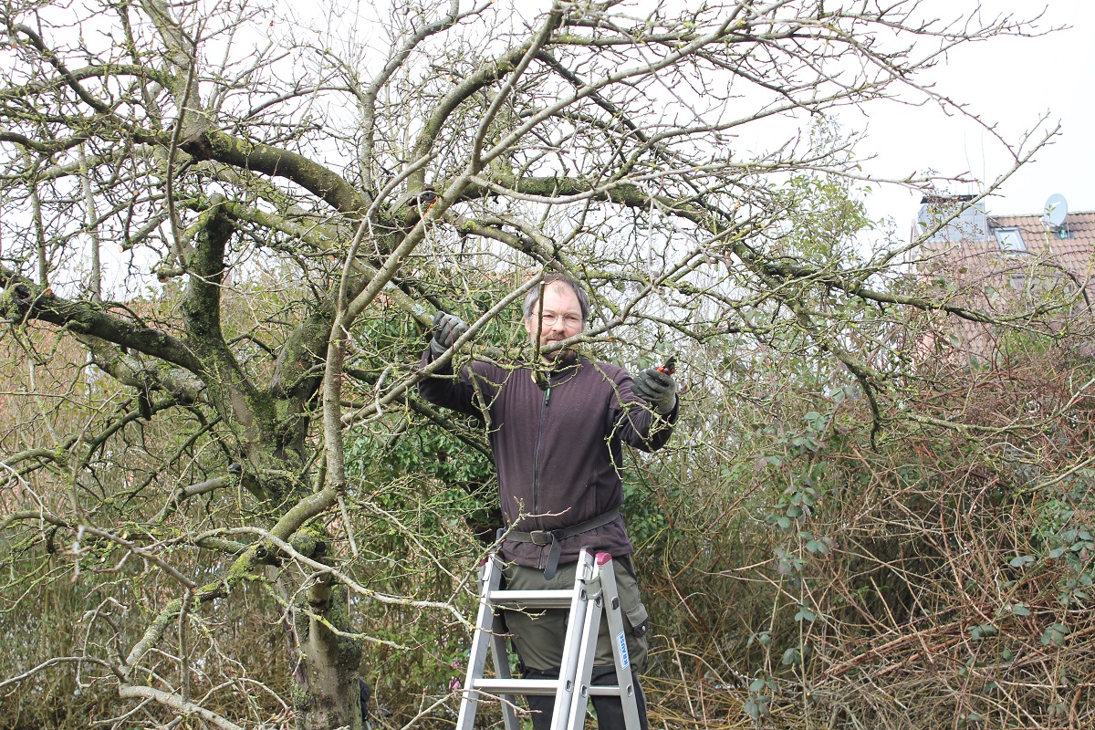 Ein Anfang wird derzeit in Kiel gemacht. Unweit unserer Geschäftsstelle, auf der weitläufigen Grünfläche im rückwärtigen Bereich des Peter-Hansen-Blocks am Westring, befinden sich insgesamt rund 30 Kirsch-, Pflaumen- und Apfelbäume. Letztere werden derzeit von Dr. Ben Schmehe bearbeitet, der als Gärtner, Baumpfleger und ausgebildeter Baumwart genau weiß, worauf es dabei ankommt. „Bei Obstbäumen handelt es sich um gezüchtete Kulturbäume. Wie auch andere Kulturpflanzen müssen diese vom Menschen gepflegt werden“, erklärt Schmehe. Denn anders als „normale“ Bäume bilden Obstbäume keine gleichmäßigen, harmonischen Kronen. Als Folge entstehen Äste, die sich gegenseitig das Licht nehmen oder sogar vom Gewicht ihrer eigenen Früchte brechen.