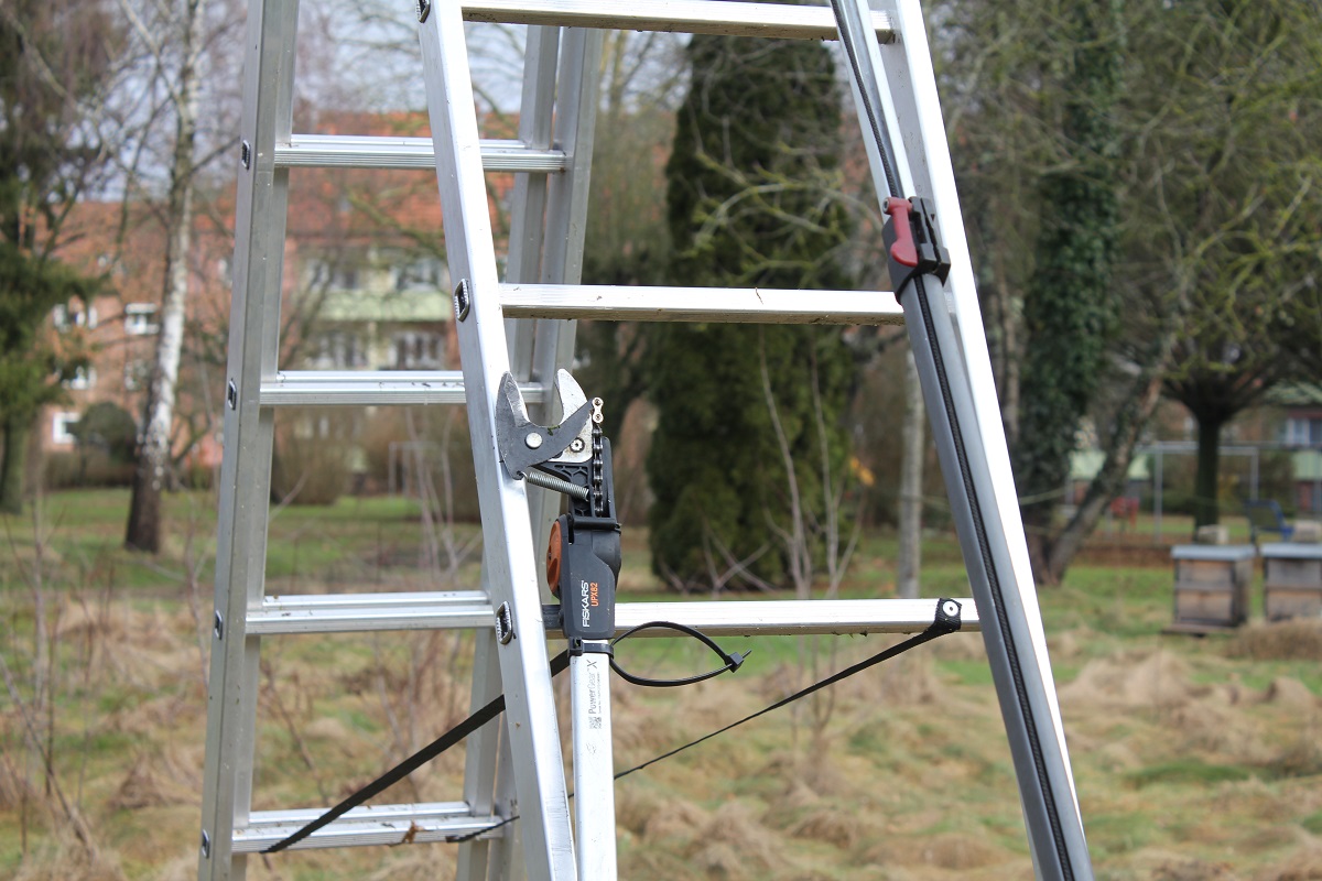 Ein radikales und wahlloses Abschneiden der Äste ist allerdings nicht die Lösung. „Ein falscher Beschnitt kann das ungewollte Wachstum der Äste noch verstärken oder dem Baum schaden.“ Und so kann man Ben Schmehe dabei beobachten, wie er zur Teleskop-Baumschere greift, um mit geschultem Blick gezielt einzelne Äste zu entfernen – immer darauf bedacht, die Verletzungen für den Baum so gering wie möglich zu halten. Bei dickeren Ästen kommt auch schon einmal die Säge zum Einsatz, die der Baumwart an seinem Gürtel trägt. „Das Ziel ist, Luft und Licht in den Baum zu bringen, so dass sich die Äste nicht gegenseitig Konkurrenz machen. Denn am Ende soll ja eine gute Ernte ermöglicht werden.“