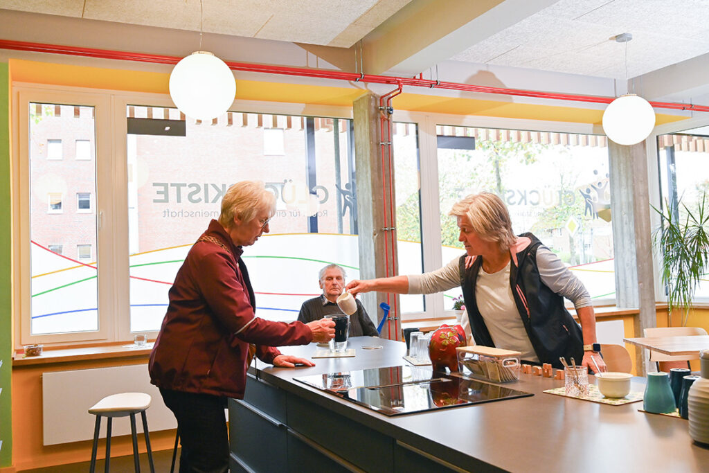 Die Glückskiste ist ein Raum für die Gemeinschaft. Geöffnet montags bis donnerstags von 9:00 bis 17:00 Uhr sowie freitags von 9:00 bis 14:00 Uhr bietet sie den Rahmen für gemeinsame Zeit, Gespräche, Spiele, Lektüre oder eine gute Tasse Kaffee. Schenken Sie sich gerne selbst etwas ein, hier werden Sie nicht bedient! Gerne dürfen Sie daher eigene Speisen und Getränke mitbringen – wenn Sie mögen, natürlich auch etwas zum Teilen.