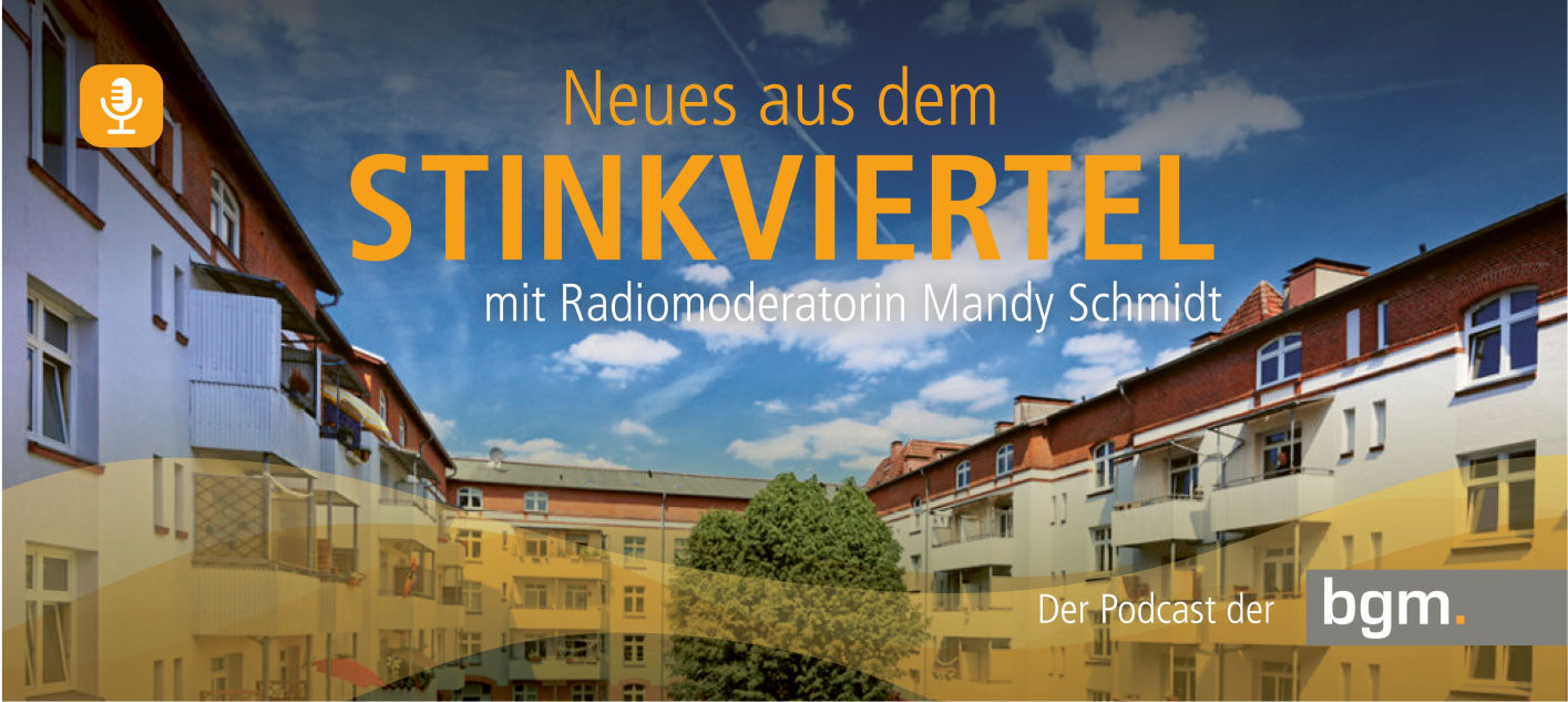 Unter dem Titel Neues aus dem Stinkviertel – Der bgm-Podcast nehmen wir in regelmäßigen Abständen Folgen mit unterschiedlichen Themenschwerpunkten auf, in denen die bgm-Vorstände Stefan Binder und Martin Ahrens ebenso wie Expertinnen und Experten aus verschiedenen Fachgebieten zu Wort kommen. Immer mit dabei ist die bekannte Radiomoderatorin Mandy Schmidt, die durch die einzelnen Folgen führt und als Gesprächspartnerin auch mal genauer nachhakt.
