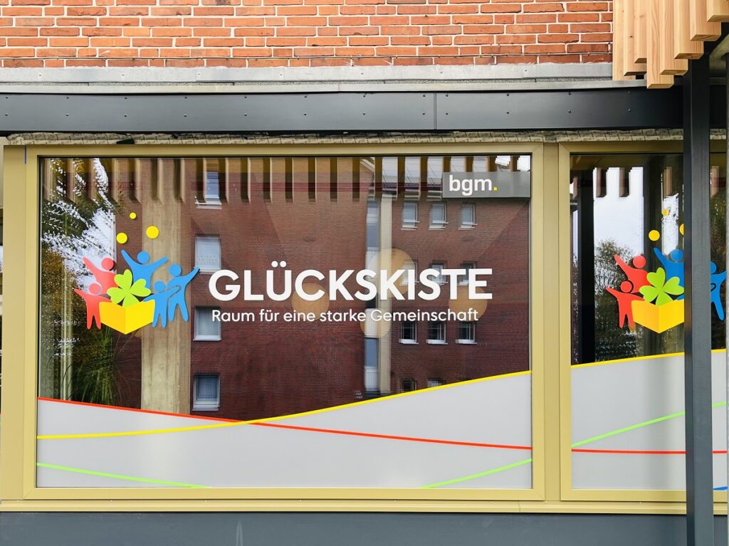Im Rahmen der Eröffnung des bgm-Treffs wurde nicht nur die Gebäudefront modern und ansprechend umgestaltet, sondern auch der Eingangsbereich zu den neuen Räumlichkeiten „nach vorne“ in Richtung der Ulmenstraße gelegt – eine Einladung an alle, gerne mal einen Blick in die Glückskiste zu werfen. Und auch im Innenbereich hat sich viel getan. So wurde der große, offene Raum mit viel Herzblut wiederhergestellt – inklusive der alten Originalfliesen an einer der Wände – und modern, farbenfroh und gemütlich eingerichtet.